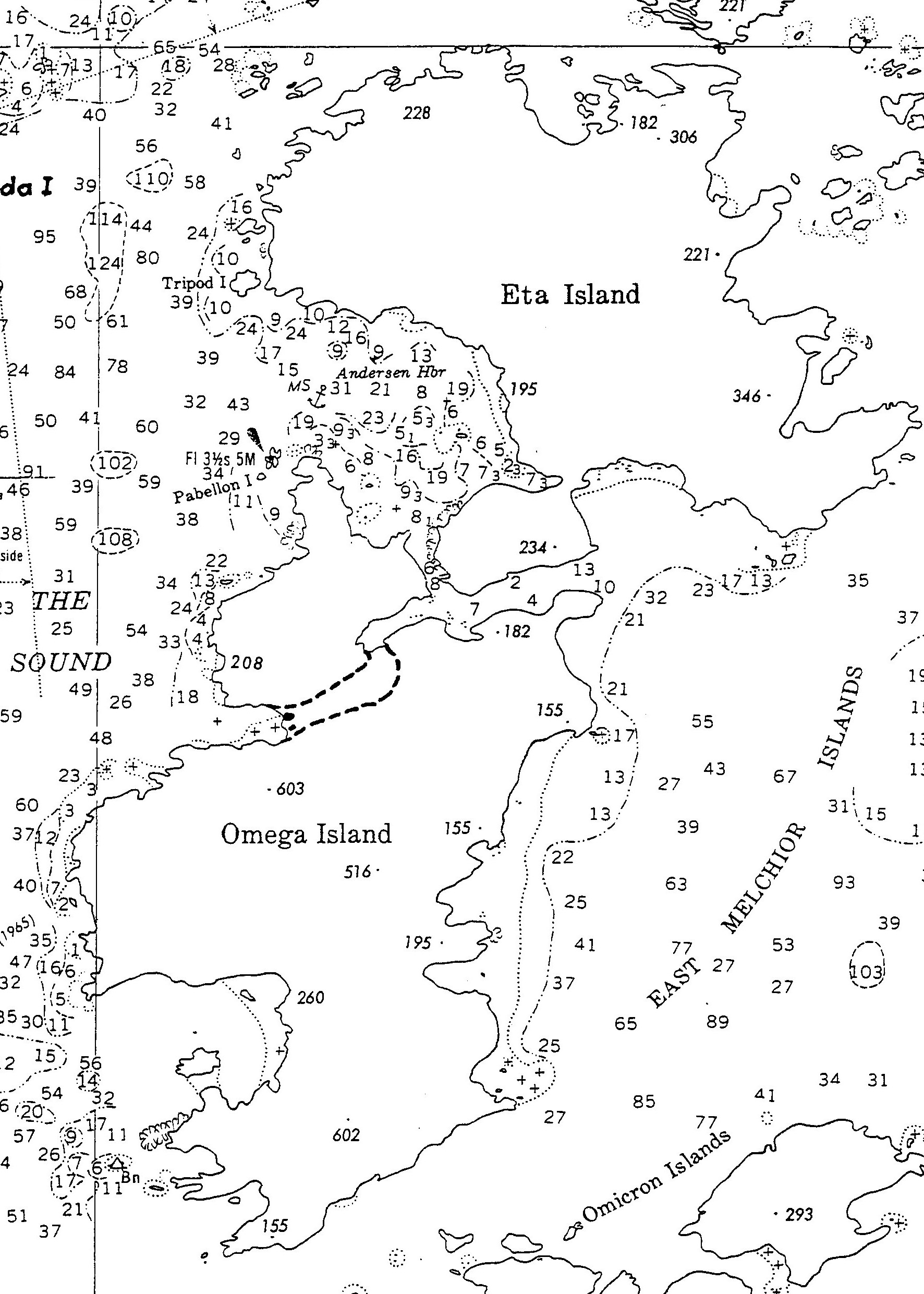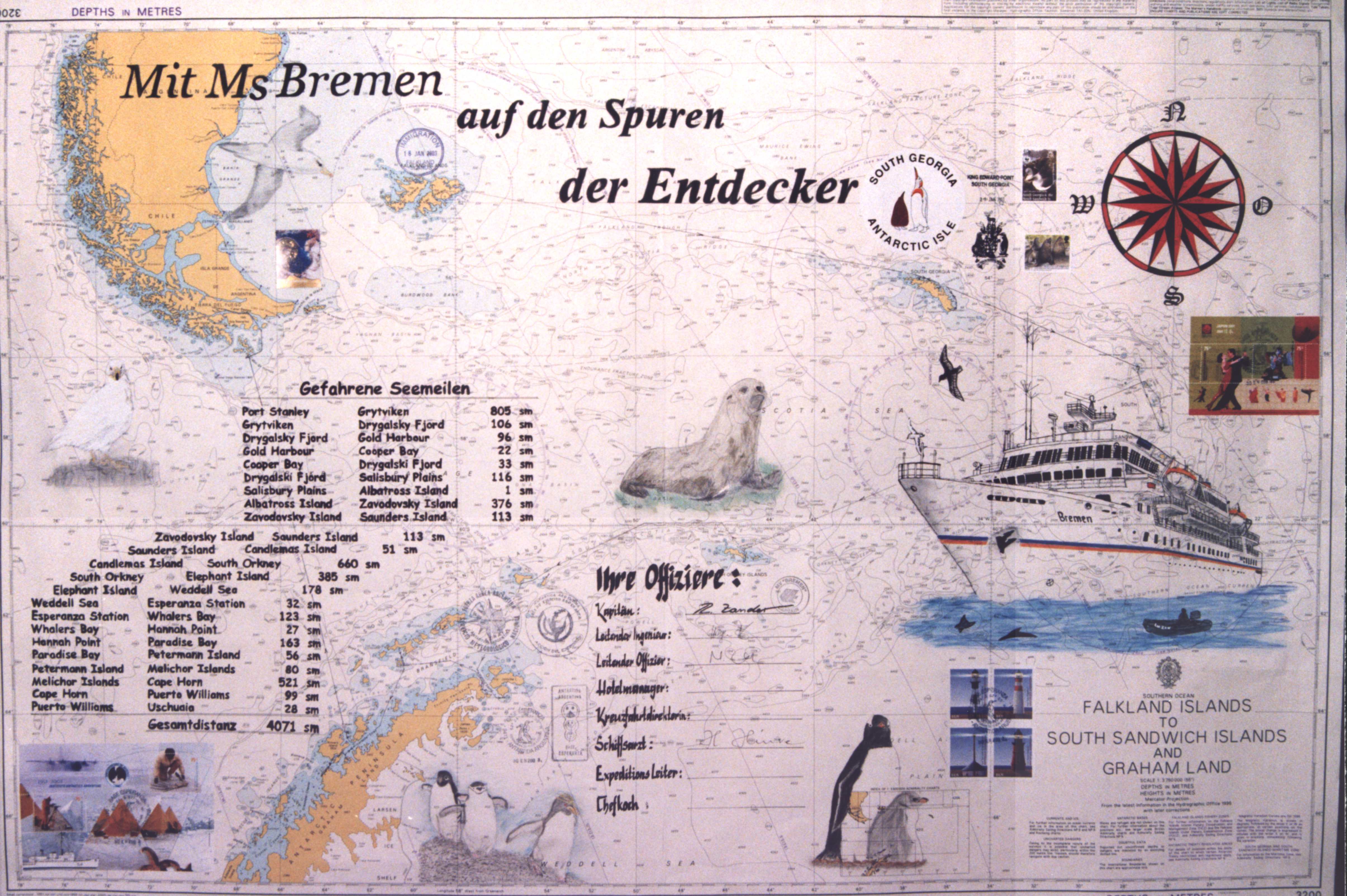 Melchior Island, Isla Sobral - Position 64°19,6' S 62°56,4' W - 2. Februar 2003 - 1100 Uhr loc. An Bord des Zodiac unter Ruderführung von Flemming Schwartz durchfuhr ich mit anderen Gästen der MS Bremen den von uns entdeckten neuen Kanal. Vor uns fuhr das zweite Zodiac unter Tomasz Zadrozny . Der neue Kanal im argentinischen Antarktissektor wurde inzwischen nach dem Mutterschiff Bremen benannt, ebenso die neue, da von Sobral abgetrennte Insel. Meines Wissens die erste maritime Landentdeckung im neuen Jahrtausend.